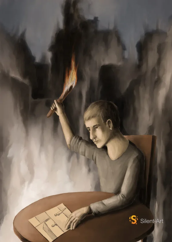 Dieses digitale Kunstwerk von Silent-Art / Jörg Hornisch fängt einen Moment stiller Reflexion ein. Eine einsame Figur hält eine Fackel in die Dunkelheit, während auf dem Tisch ein geheimnisvolles Blatt Papier liegt. Die warmen Flammen kontrastieren mit den kühlen Schatten und verleihen dem Werk eine mystische, zeitlose Ausstrahlung. Ein besonderes Stück für Liebhaber zeitgenössischer Kunst und Sammler digitaler Malerei.