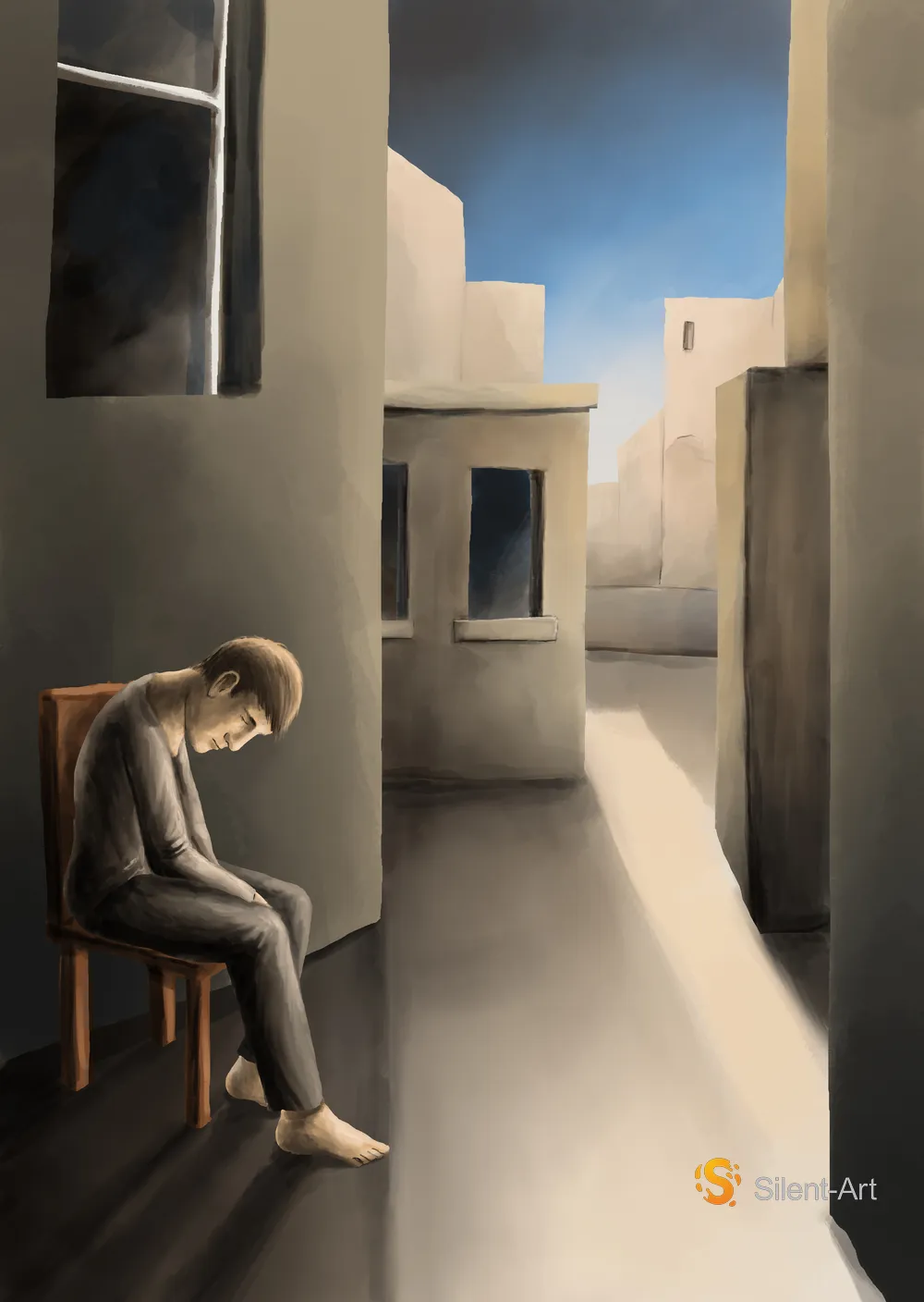 Dieses Werk von Silent-Art (Jörg Hornisch) visualisiert auf eindrucksvolle Weise die Spannung zwischen innerer Isolation und äußerer Hoffnung. Ein junger Mann schläft regungslos in einer lichtdurchfluteten Gasse, umgeben von anonymen Gebäuden, während hinter ihm der Himmel in hellem Blau erstrahlt. Ein intensives Bild für Sammler und Kunstliebhaber, die stille, emotionale Tiefe und symbolische Aussagekraft schätzen.