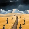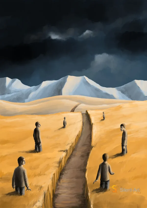 Ein gerader Graben zieht sich durch ein goldenes Feld. Figuren stehen links und rechts bis zur Hüfte im Korn, ohne Bewegung. Die klare Linie führt den Blick in die Tiefe, Berge setzen eine helle Kulisse unter dunklem Himmel. Die Arbeit von Silent-Art mit Jörg Hornisch bündelt Ruhe und Spannung. Bildaufbau und Kontraste geben Orientierung.
