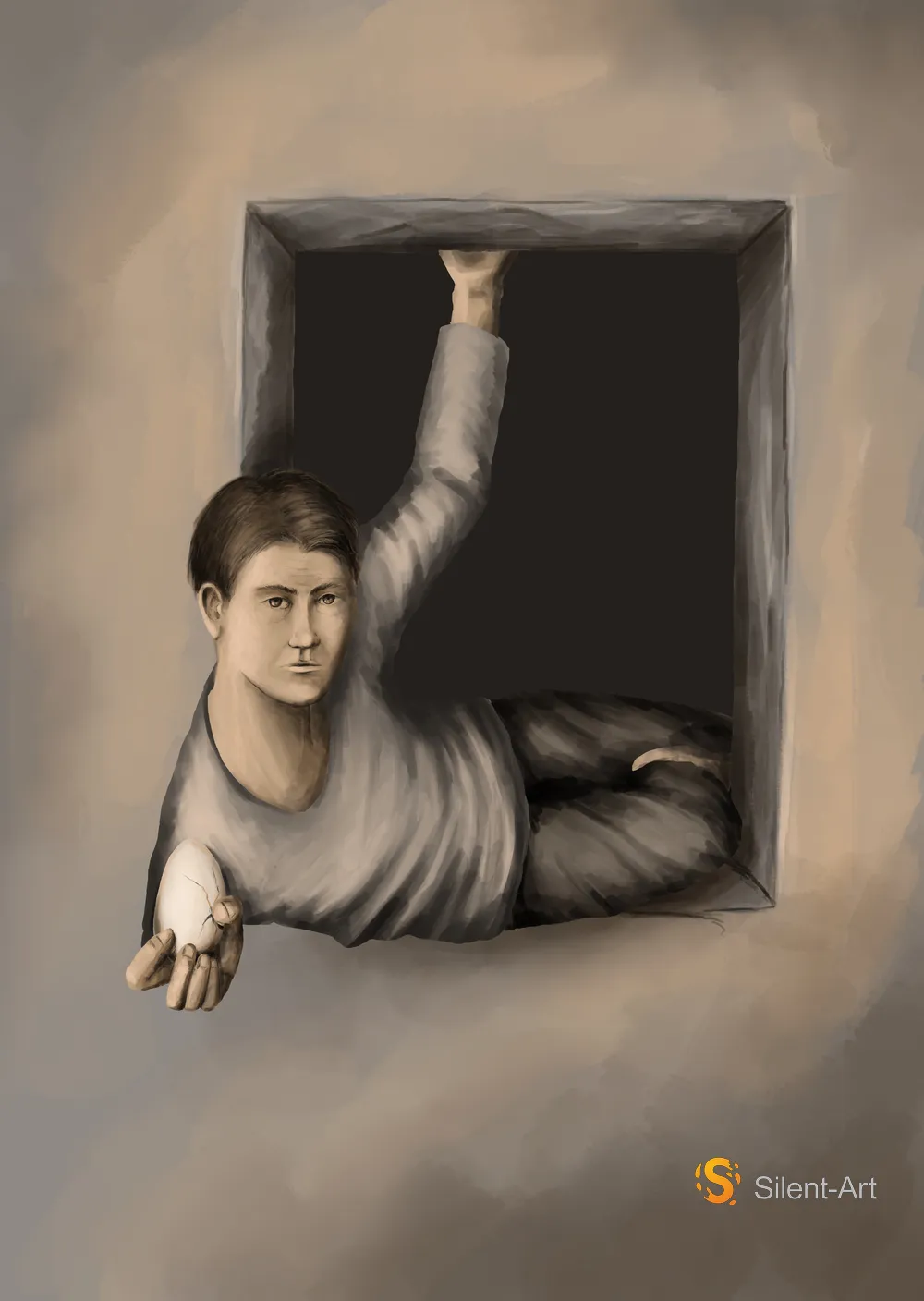 Du blickst auf eine Figur, die halb in einer Öffnung liegt und ein angeschlagenes Ei nach vorn reicht. Das tiefe Schwarz dahinter lässt den Körper klar hervortreten. Die Hand an der Kante hält die Spannung, der Blick bleibt ruhig. Weiche Grauwerte und präzise Ränder führen deinen Fokus. Die Arbeit von Silent-Art mit Jörg Hornisch setzt auf Reduktion und Balance.