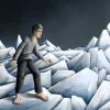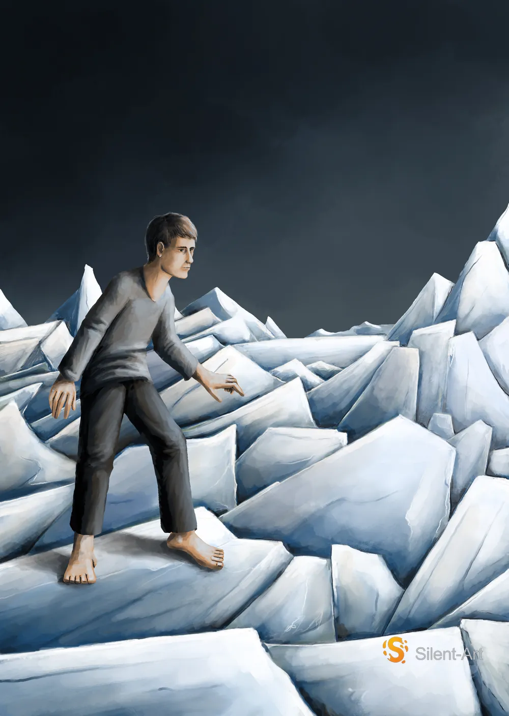 Eine Person balanciert barfuß über kantiges Eis. Die Hände sind geöffnet, der Schritt bleibt tastend. Weiß gebrochene Flächen bilden Stufen und Kanten, der Himmel liegt dunkel darüber. Die klare Geometrie führt den Blick in die Tiefe und rahmt die Figur. In einer Arbeit von Silent-Art mit Jörg Hornisch treffen Ruhe und Spannung präzise aufeinander.