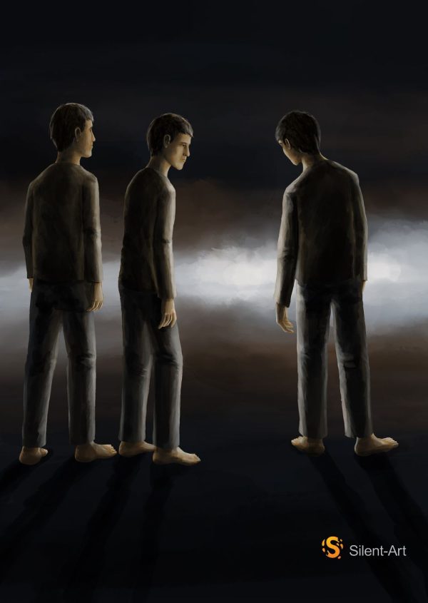 Drei barfüßige Gestalten stehen vor einem Lichtband und halten Abstand zueinander. Die wechselnden Perspektiven erzeugen eine ruhige, konzentrierte Spannung. Licht, Schatten und weiche Übergänge lenken den Blick über die Körperhaltungen und lassen Raum für Lesarten. Das Motiv von Silent-Art mit Jörg Hornisch richtet sich an Sammlungen, die stille Narrative und klare Kompositionen schätzen.