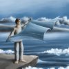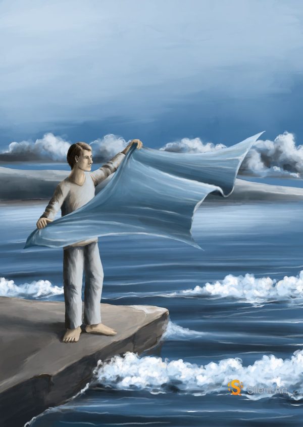 Eine Figur steht auf einer Kante über dem Wasser und hält ein weites Tuch gegen den Wind. Die Linien des Stoffes folgen der Luft und spiegeln die Bewegung der Wellen. Helles Blau und kühle Grautöne öffnen den Raum und führen den Blick in die Ferne. Das Motiv von Silent-Art mit Jörg Hornisch verbindet Ruhe und Spannung in einer klaren Komposition.