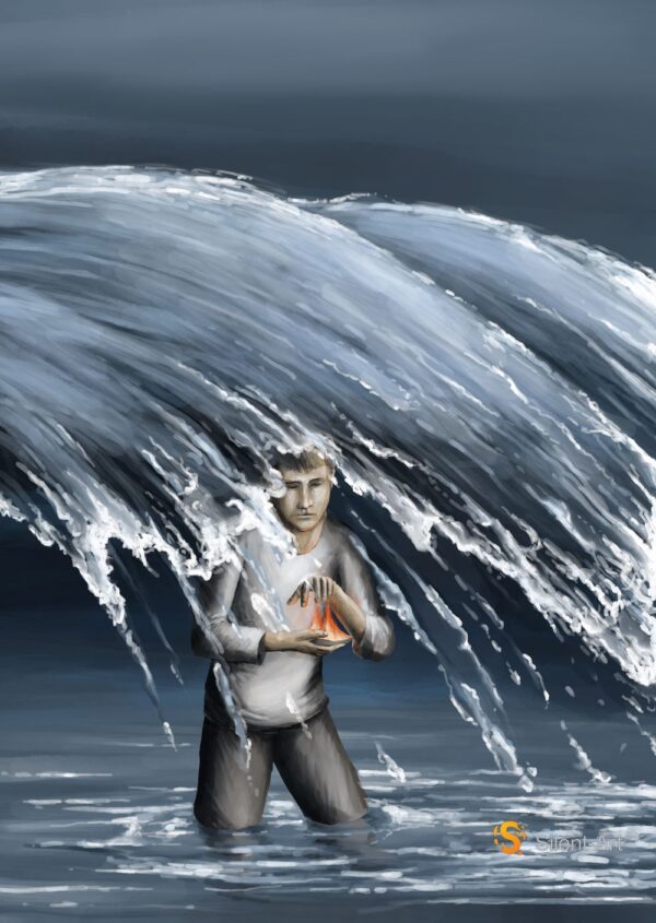Du blickst auf eine Figur, die bis zu den Knien im Wasser kniet und den Oberkörper leicht nach vorne neigt. Über ihr zieht eine große Welle quer durch das Bild, ihre weiße Gischt fällt in langen Strähnen auf die Person herab und füllt fast den gesamten oberen Bildraum. Die Umgebung bleibt in dunklen Blau und Grautönen zurückhaltend, während in den Händen der Figur ein kleines orangefarbenes Objekt leuchtet und das Gesicht von unten weich beleuchtet. Das Kunstwerk von Silent-Art und Jörg Hornisch verbindet die Bewegung des Wassers mit einem ruhigen Zentrum und erzeugt eine klare zeitgenössische Bildwirkung.