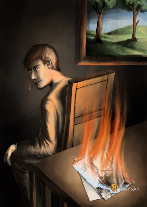 as Motiv verbindet eine konzentrierte Figur mit einem einzigen, starken Ereignis auf der Tischfläche. Das Feuer erzeugt eine warme Lichtzone, die den Raum formt und die Haltung der Person schärft. Die Dunkelheit ringsum hält die Szene geschlossen, während das gerahmte Landschaftsbild im Hintergrund wie ein ruhiger Gegenraum wirkt. Silent-Art und Jörg Hornisch zeigen Moderne Kunst als präzisen Kontrast aus Wärme, Schatten und innerer Spannung.