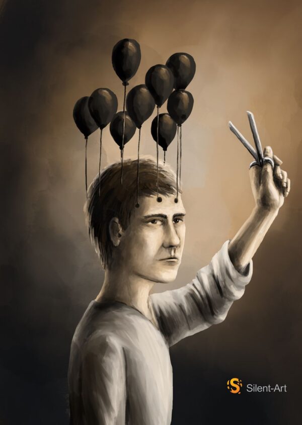 Du erhältst ein Werk, das eine einzelne Figur in klarer Seitenansicht zeigt und den Blick auf ein ungewöhnliches Detail lenkt. Über dem Kopf bündeln sich schwarze Ballons, die mit feinen Linien zur Kopfpartie führen und den Raum über der Figur verdichten. Die erhobene Hand mit scherenähnlichem Werkzeug setzt eine präzise, ruhige Spannung. Der Hintergrund bleibt weich und atmosphärisch in Sepia und Dunkelgrau, sodass Motiv und Kontrast im Mittelpunkt stehen. Silent-Art von Jörg Hornisch steht hier für Moderne Kunst mit konzentrierter Bildsprache.