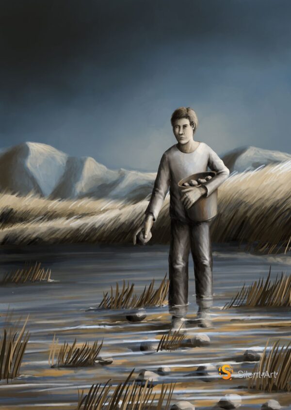 Du siehst eine klare Komposition aus Figur und Landschaft. Im Vordergrund liegt flaches Wasser, durchzogen von Schilf und einzelnen Steinen. Der junge Mann steht zentral und hält einen Eimer, in dem mehrere runde, helle Elemente liegen. Seine nach unten geführte Hand setzt einen präzisen Moment innerhalb der ruhigen Weite. Die zurückhaltende Farbwelt aus Blau, Grau und sandigen Tönen lässt Himmel, Berge und Schilfflächen leise zusammenwirken. Silent-Art von Jörg Hornisch steht dabei für Moderne Kunst mit reduzierter Präsenz.