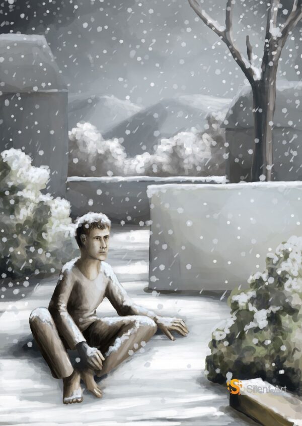 Du siehst ein Werk, das den Moment im Schneefall in eine klare, ruhige Bildordnung bringt. Die sitzende Figur im Vordergrund steht im Kontrast zu den hellen Mauern und den verschneiten Sträuchern, während die fallenden Flocken den Raum gleichmäßig füllen. Der kahle Baum und die entfernten Bergformen geben Tiefe, ohne die Stille zu brechen. Die zurückgenommene Farbwelt aus Grau, Weiß und gedämpften Naturtönen hält den Blick auf Haltung, Licht und Atmosphäre. Silent-Art von Jörg Hornisch steht hier für Moderne Kunst mit reduzierter Präsenz.