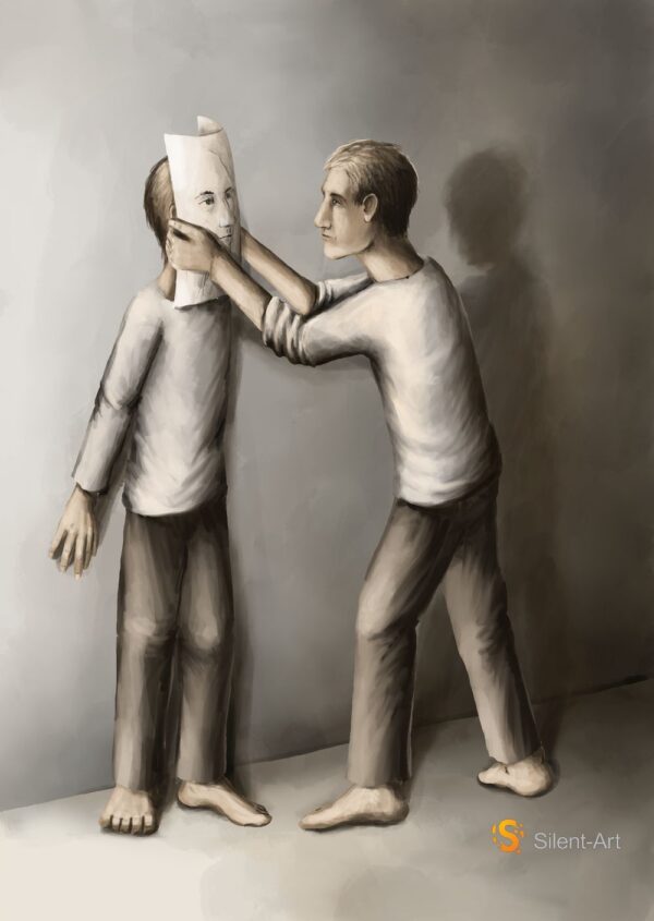Der Mann rechts hält dem Mann links ein Blatt Papier vor das Gesicht. Auf dem Papier ist eine Kopfansicht in feinen Linien gezeichnet. Die Hände greifen an die Kanten des Blatts und an den Hinterkopf, der Blick des rechten Profils ist klar ausgearbeitet.
