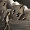 Das Motiv zeigt eine männliche Figur in einfacher heller Kleidung die barfuß über eine flache dunkle Ebene schreitet. Im Hintergrund befinden sich mehrere graue Wohnhäuser mit Satteldächern welche in unterschiedlichen Winkeln zur Seite geneigt sind. Einige Gebäude wirken als würden sie im Boden versinken während markante Risse die Fassaden durchziehen. Die Fensteröffnungen sind teilweise verschoben oder stehen leer.