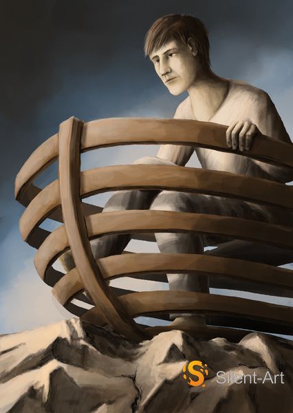 Eine männliche Figur sitzt auf felsigem Untergrund, umgeben von weit geschwungenen Holzbögen, die spiralförmig um ihren Körper verlaufen. Der Blick der Figur ist leicht seitlich nach oben gerichtet, die Körperhaltung ruhig und aufrecht.