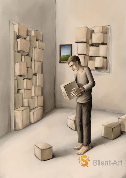Die Darstellung zeigt einen Innenraum mit hellen Wänden und einem glatten Boden. Im Zentrum steht eine männliche Person in schlichter Kleidung die einen quadratischen Karton vor dem Körper hält. Die Haltung der Figur ist leicht nach vorne gebeugt. Im Hintergrund links ist eine Türöffnung zu sehen die bis oben hin mit dicht gestapelten Kartons gefüllt ist. Eine ähnliche Öffnung an der rechten Wand zeigt ebenfalls eine dichte Ansammlung von Schachteln.