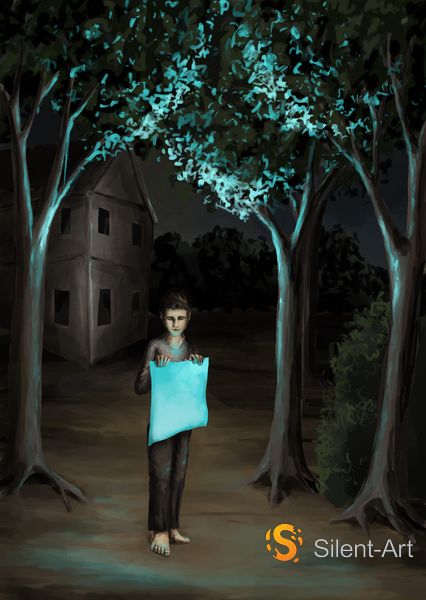 Im Zentrum steht eine barfüßige Gestalt – aufrecht, still, zwischen mächtigen Baumstämmen in tiefer Nacht. In ihren Händen liegt ein türkisfarbenes Rechteck, dessen Leuchten das einzige helle Zeichen in einer ansonsten vollständig abgedunkelten Waldwelt ist. Das Licht fällt weich nach oben, streift Gesicht und Oberkörper der Figur und taucht den unmittelbaren Umraum in ein kühles Schimmern. Über den Stämmen glühen die Laubkronen in ähnlichem Türkiston – Licht und Natur in einer stillen visuellen Entsprechung. Im Hintergrund zeichnet sich die gedämpfte Form eines Hauses ab, nah genug, um präsent zu sein, und doch vollständig in die Dunkelheit zurückgetreten. Die Farbpalette bewegt sich zwischen tiefen Erdtönen, Schwarz und dem einzigen, klar gesetzten Türkis.
