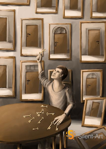 Eine Figur sitzt an einem runden Holztisch, in der erhobenen Hand ein goldener Schlüssel. Auf dem Tisch vor ihr liegen weitere goldene Schlüssel – verstreut, als wären sie im Laufe der Zeit hier zusammengekommen, einer nach dem anderen.