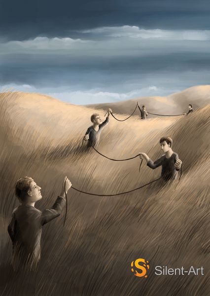 Vier Figuren stehen verteilt in einem weiten Grasfeld. Zwischen ihnen verläuft eine einzige dunkle Linie – sie wird gehalten, weitergegeben, von einer Hand zur nächsten geführt. Der Boden wellt sich in sanften Hügeln, das Gras liegt in einem tiefen, trockenen Gold. Weiter im Hintergrund, oben am Hangrand, sind zwei weitere Gestalten zu erkennen – die Linie reicht bis zu ihnen.