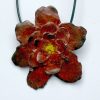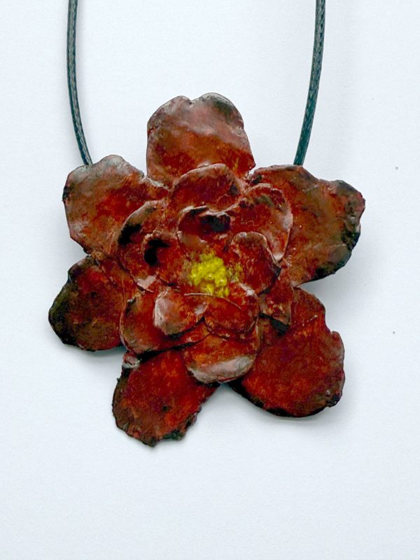 Jeder Anhänger wird einzeln gefertigt – die Bronze von Hand geformt, gebrannt, anschließend behandelt, bemalt und zum Schutz lackiert. Durch diese aufwendige Bearbeitung entsteht eine intensive, rotbraune Farbwirkung mit feinen Nuancen, die der Blüte ihre lebendige Ausstrahlung verleihen. Das zarte Gelb im Zentrum setzt einen leuchtenden Akzent.